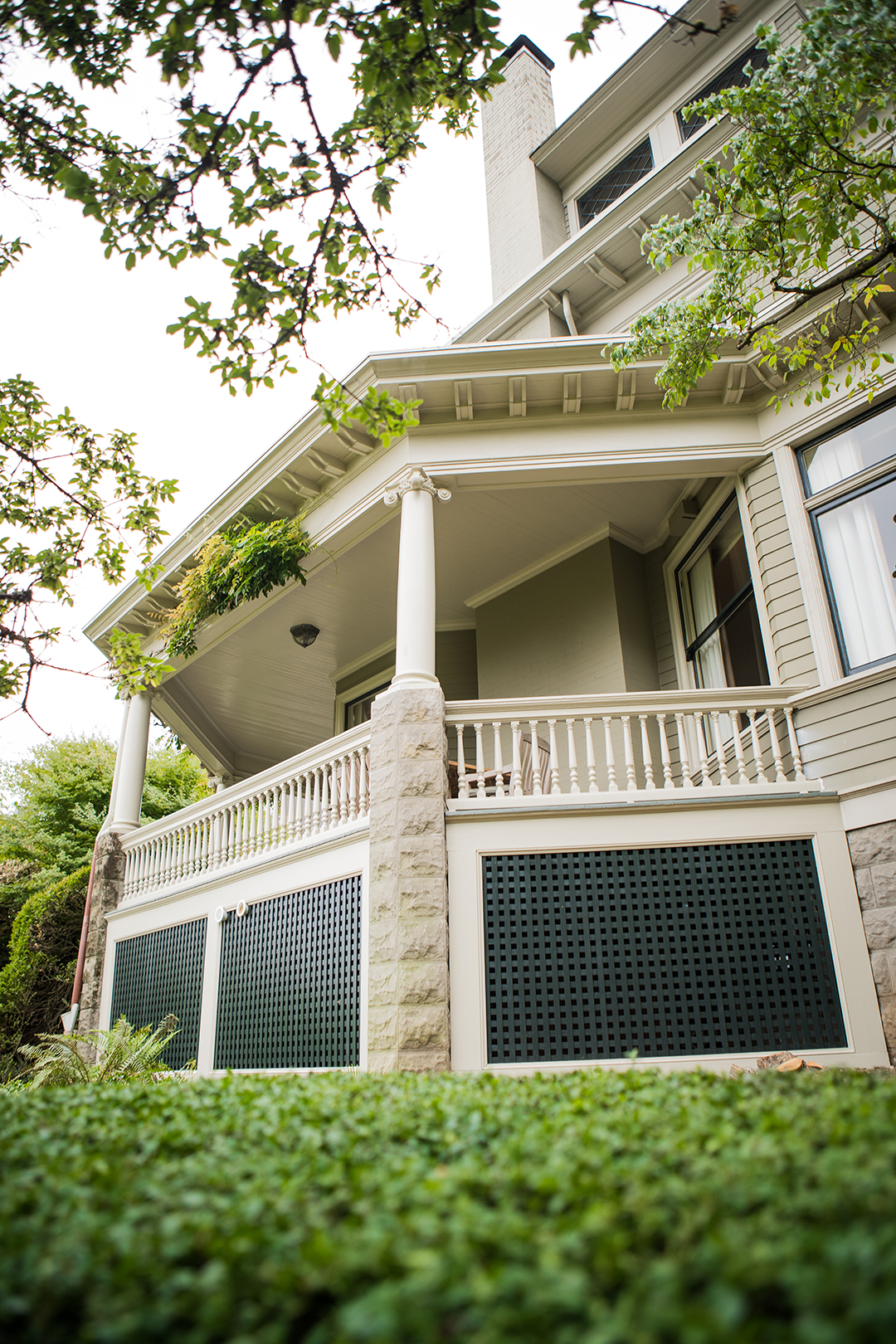 Restoration of this early 1900’s home included extensive repair work to the wood balustrades, porch roof and cornice soffits. The entire lower porch lattice panels and wood trim were rebuilt and repaired, involving extensive carpentry, paint removal and finish paint work.