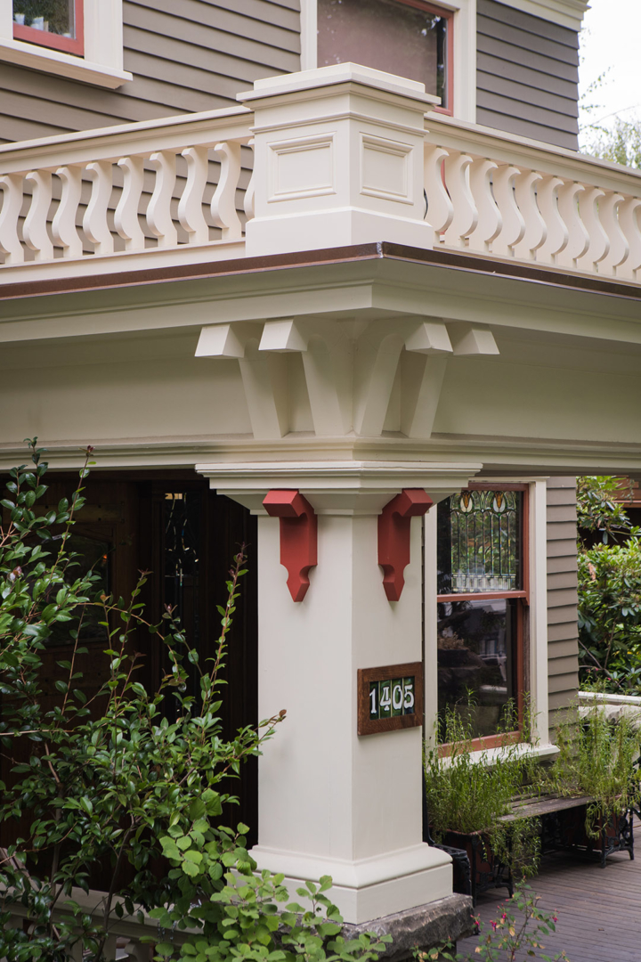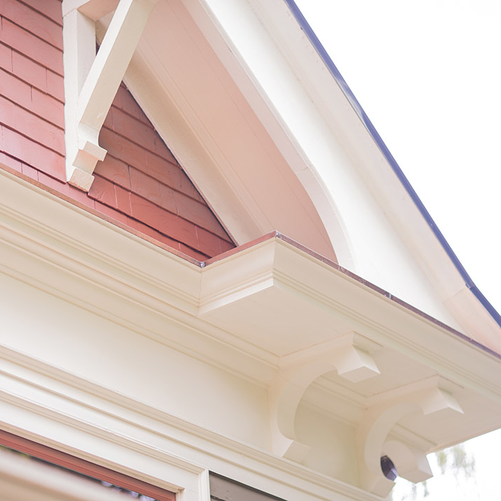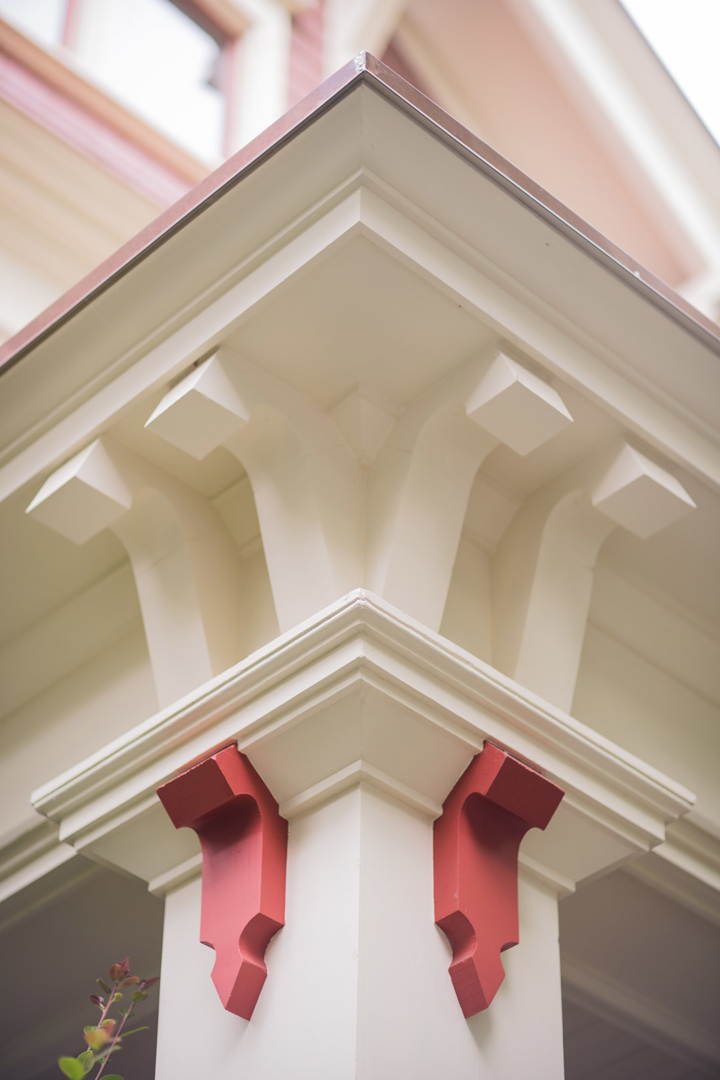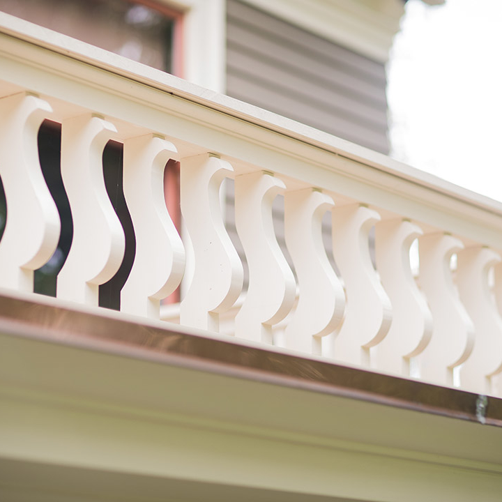 This exquisitely detailed historic home needed extensive repairs to its roof cornices and porch. Restoration included rebuilding porch columns, supporting entablature beams, porch roof, and roof line balustrade and pedestal system. Copper sheet metal was used in an historically accurate gutter system. New paint colors further refreshed the home.